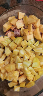 - lila és fehér édesburgonya (héjában, darabolva, sütőben sütve) - a Zöld Tanya közösségi biokertből)